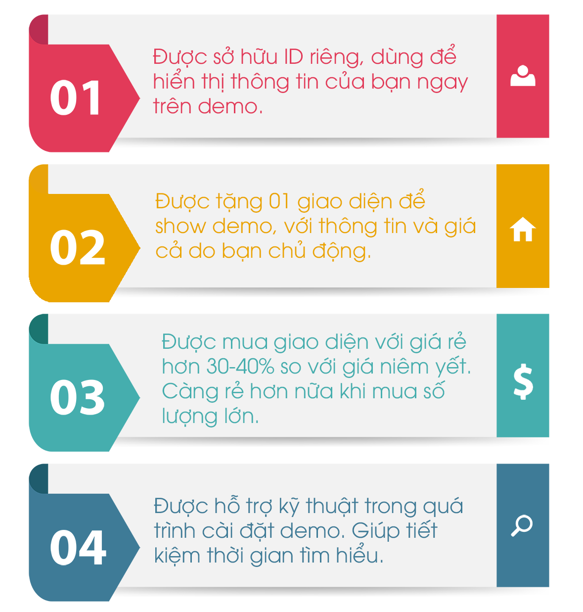 Nắm bắt được nhu cầu đó, Chúng tôi cung cấp cho bạn một giải pháp tuyệt vời . Khi đăng ký làm đối tác với chúng tôi, bạn sẽ có ngay kho demo hàng trăm mẫu website , đa dạng ngành nghề, giúp bạn dễ dàng tiếp cận với nhu cầu của khách hàng hơn – Mà chi phí bỏ ra để xây dựng là 0 Đồng !